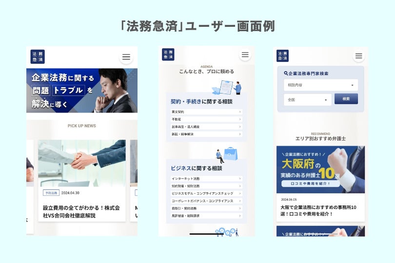 「法務急済」とは、企業が直面する法的問題に対して、最適な弁護士や法務専門家を検索、問い合わせ、相談予約、そして実際に相談することで法的問題を解決へと導く企業法務のワンストップサービスです。(企業と弁護士をつなぐプラットフォームとなります。)