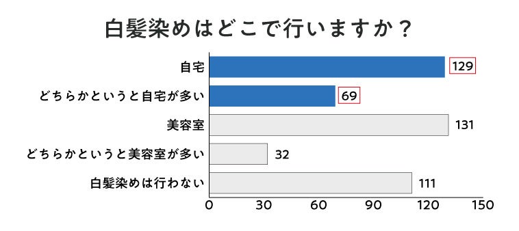 白髪染めを行わないと返答した111人を除いた361名の中で、白髪染めを行う場所を「自宅」「どちらかというと自宅が多い」と答えたのは約55%。