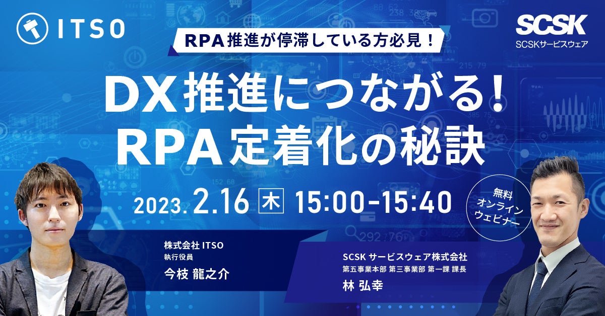 SCSKサービスウェア株式会社(本社:東京都江東区、代表取締役社長:渡辺 篤史)は、株式会社ITSO執行役員今枝龍之介氏をゲストに迎え「~RPA推進が停滞している方必見!~DX推進につながる!RPA定着化の秘訣」と題したオンラインセミナーを2023年2月16日(木)に開催いたします。