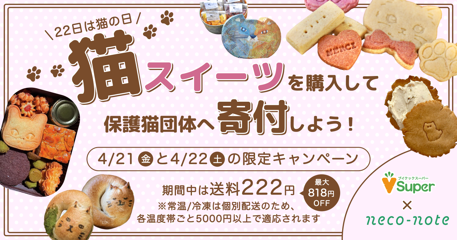 ブイクックスーパー×neco-noteのコラボ企画。猫の日キャンペーンでは、お客様にかわいいヴィーガン猫スイーツをお楽しみいただく、と同時に「保護猫団体への支援」を行います!猫の日キャンペーンでは、お客様と全国の猫ちゃんたちが幸せになる機会の創出を目的としています。