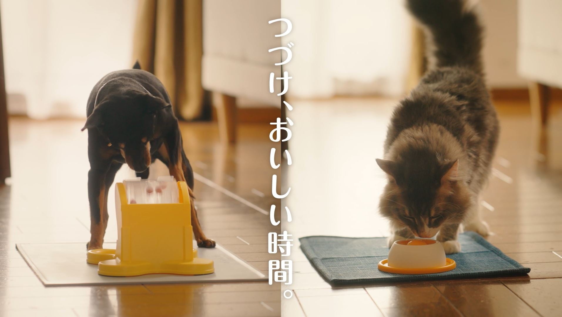 CM制作背景:CMの『でるでる・ぺろぺろ篇』は、わんちゃん・ねこちゃんのより楽しく、より長く、美味しい時間をお届けすることで、「うちの子もできるかな?」というワクワクさを伝えたいという気持ちから制作いたしました。見たことのないレアなしぐさやぺろぺろに夢中になっている姿をぜひご覧ください。
