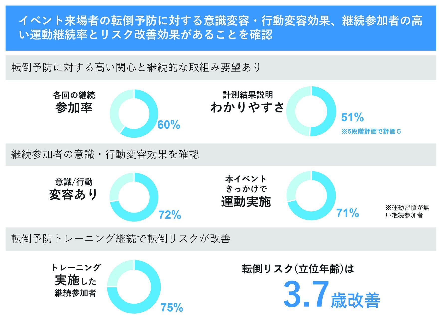イベント来場者の転倒予防に対する意識変容・行動変容効果、継続参加者の高い運動継続率とリスク改善効果があることを確認