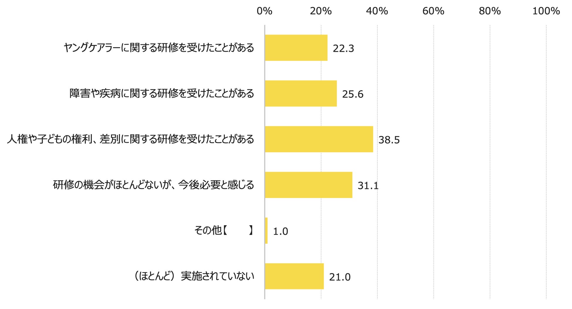 ヤングケアラーに関する研修を受けた教員は少なく、学校現場での支援方法を学ぶ機会が限られています。教員が必要な知識とスキルを習得できる研修の充実が望まれています。