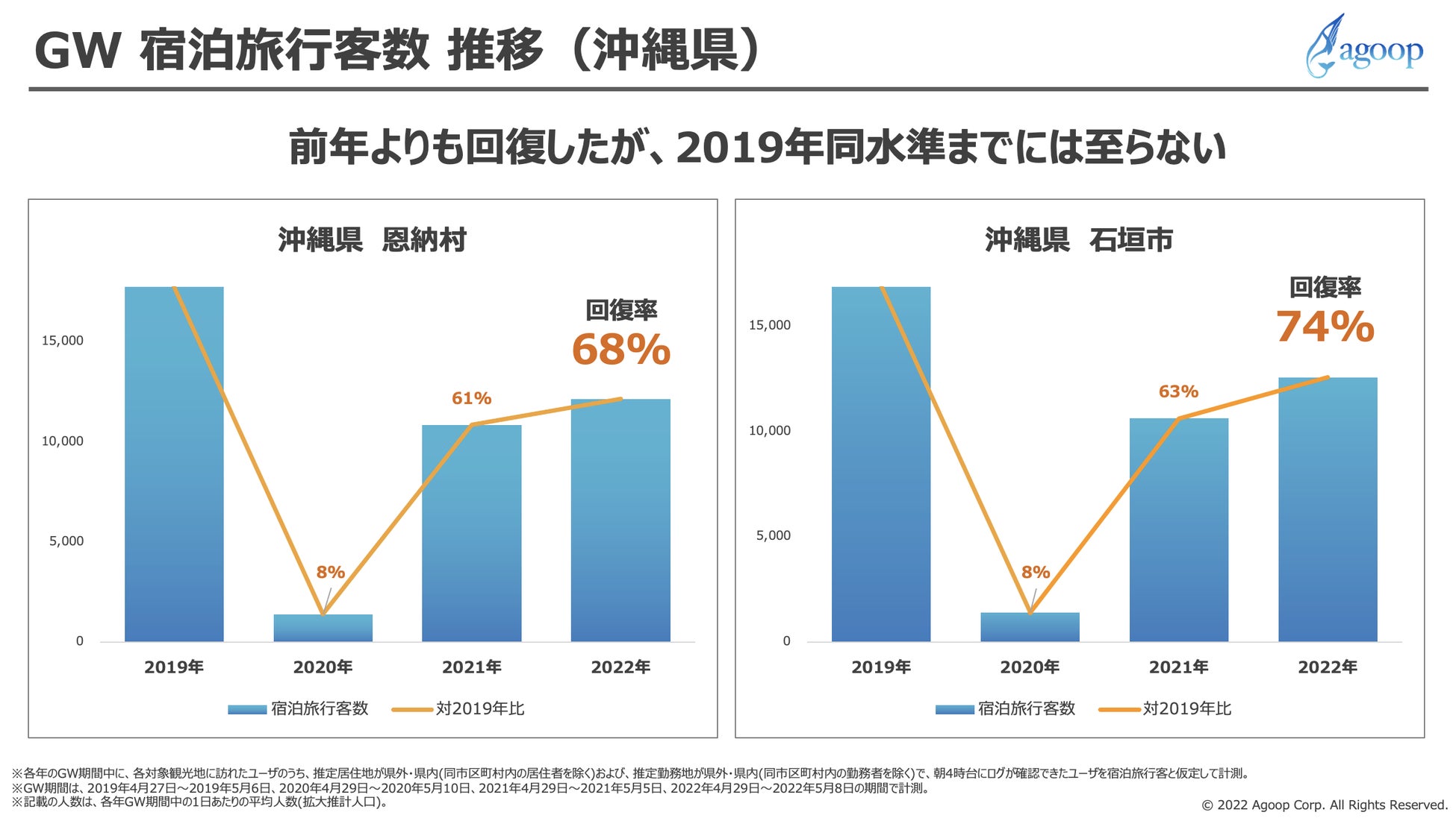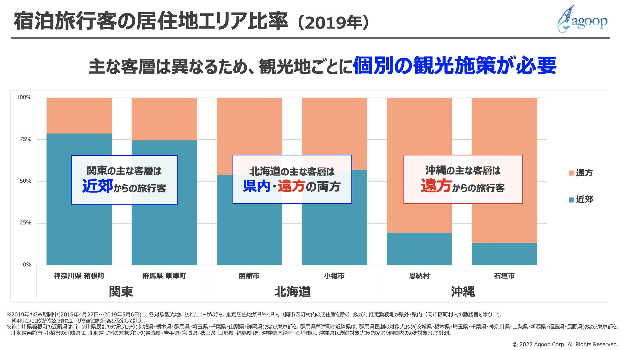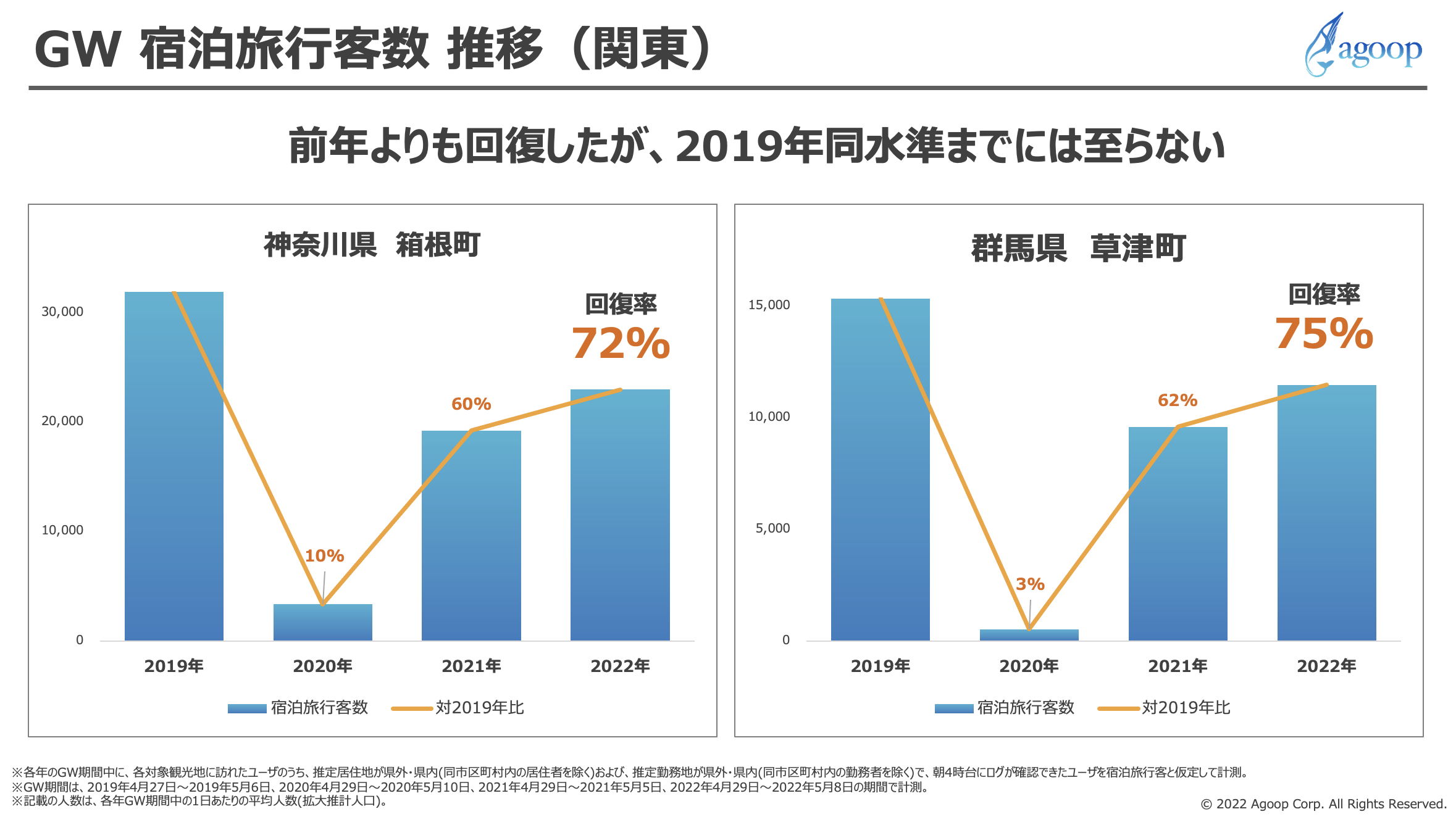 ※2019年~2022年の各GW期間中に、各対象観光地に訪れたユーザのうち、推定居住地が県外・県内(同市区町村内の居住者を除く)および、推定勤務地が県外・県内(同市区町村内の勤務者を除く)で、朝4時台にログが確認できたユーザを宿泊旅行客と仮定して計測。