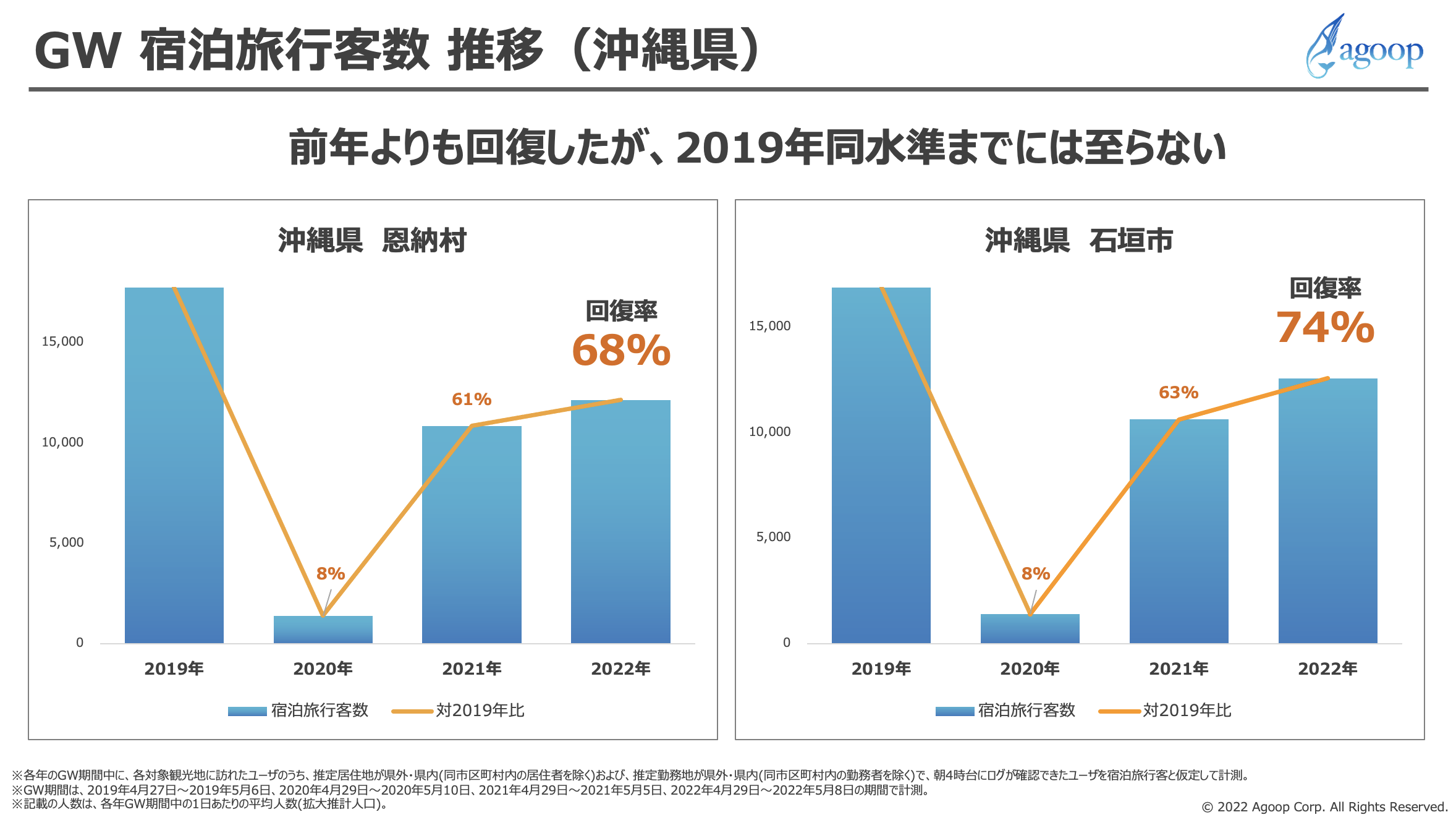 2019年と比べた増減率では、-50%前後の関東や北海道に比べ、遠方からの宿泊客の回復率が高く、恩納村で-37%、石垣市で-20%でした。