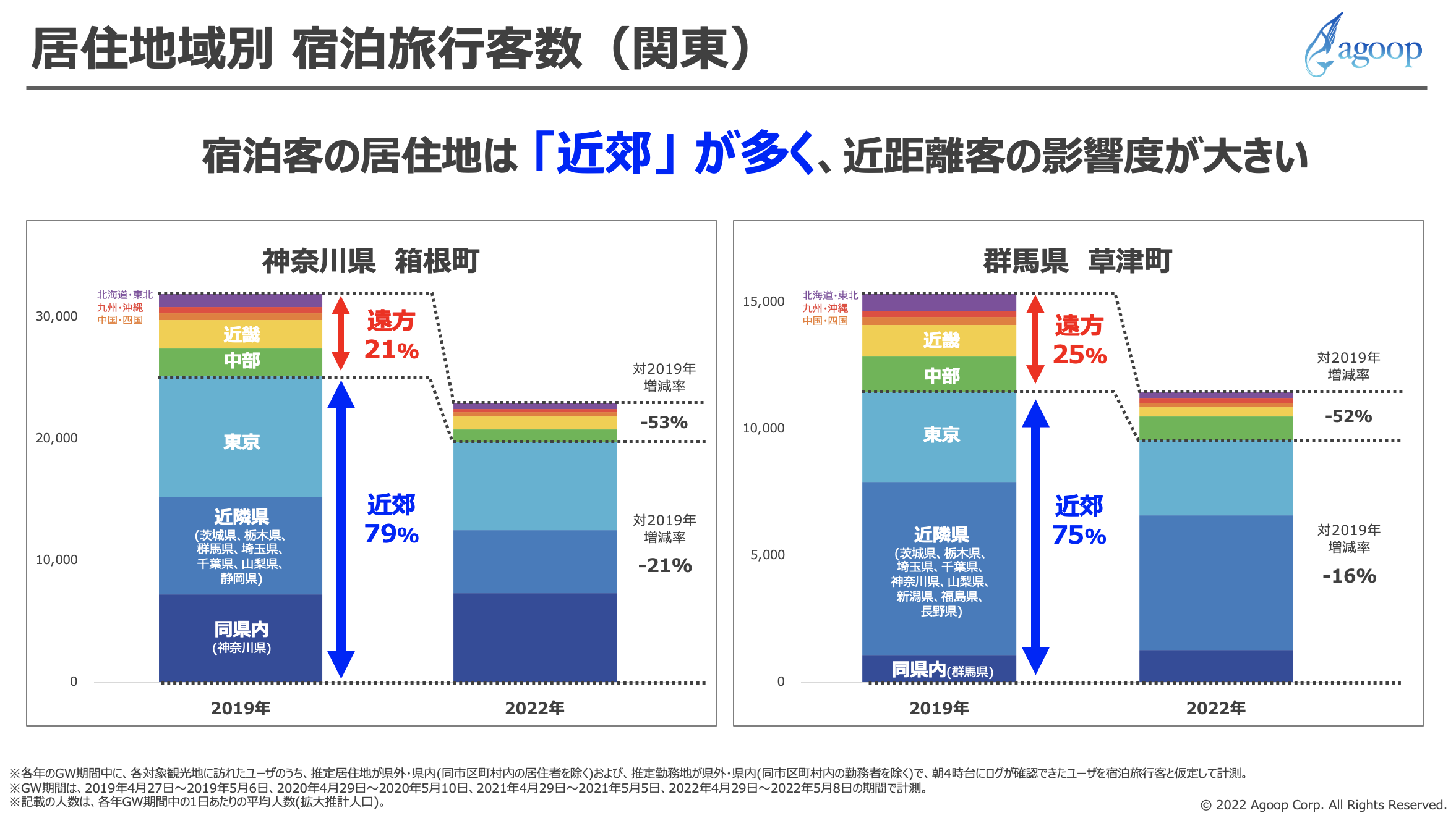 2019年と比べた増減率では、箱根町が、近郊が-21%、遠方が-53%、草津町は、近郊が-16%、遠方が-52%と、近郊からの宿泊客の方が回復率が良いと分かりました。