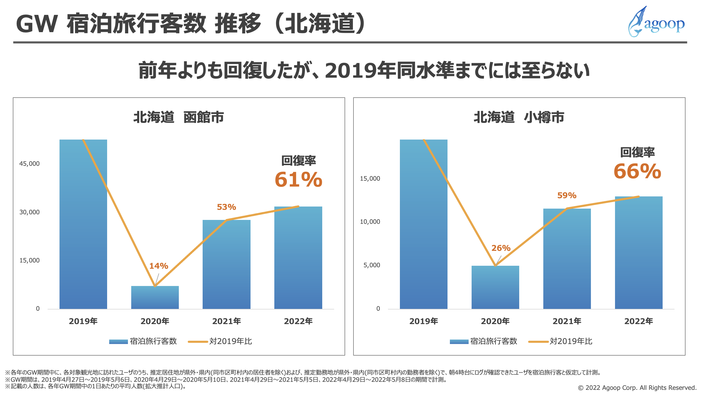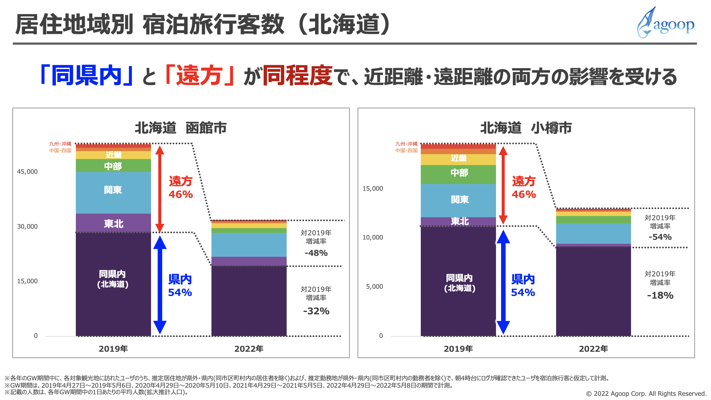 2019年と比べた増減率では、函館市が、県内が-32%、遠方が-48%、小樽市は、県内が-18%、遠方が-54%と、県内からは回復率が良い一方、遠方からは回復率が芳しくないことが分かりました。