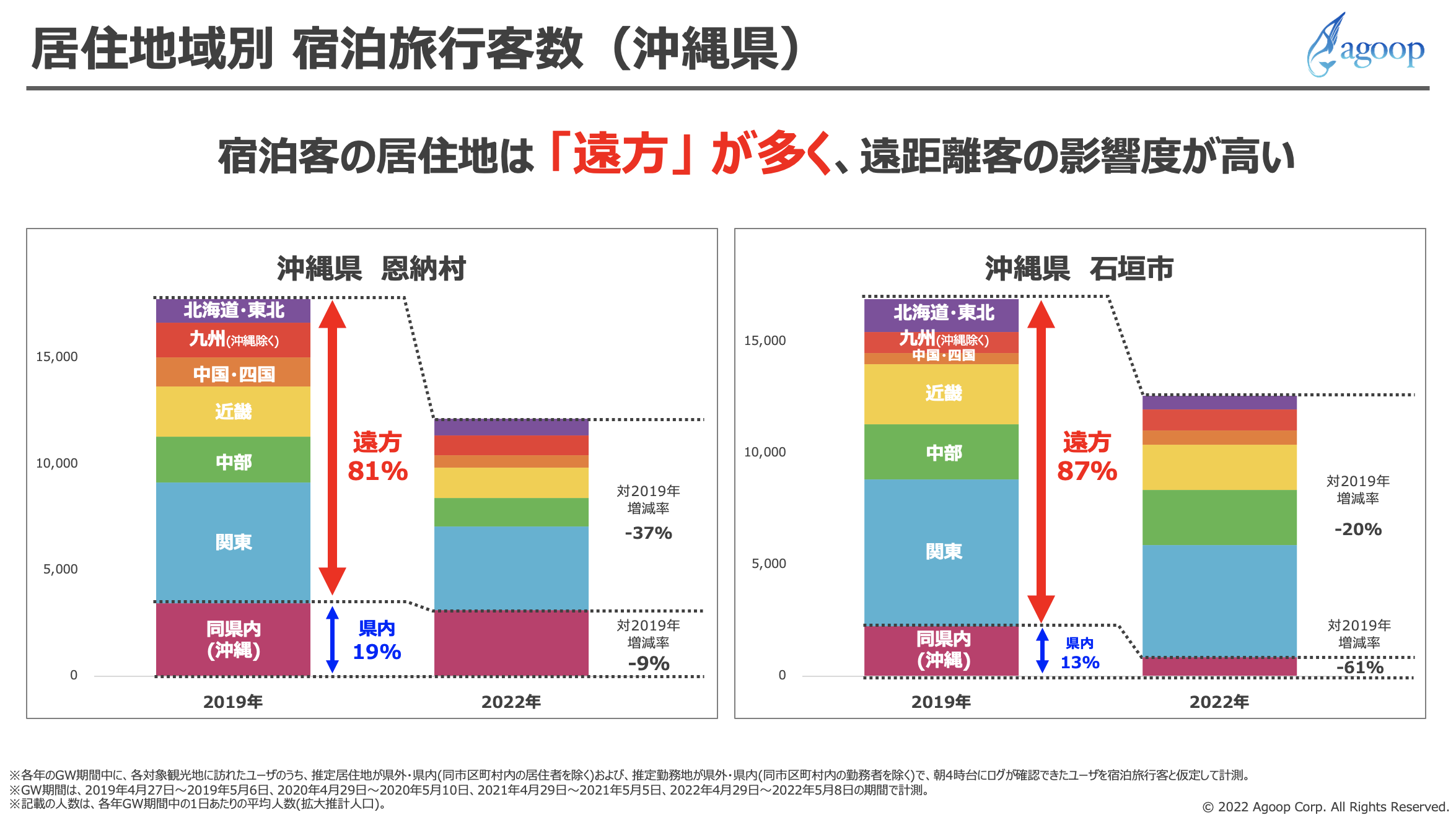 恩納村・石垣市は、もともと遠方からの宿泊客が多く、遠距離旅行客の影響が大きい観光地であると分かりました。