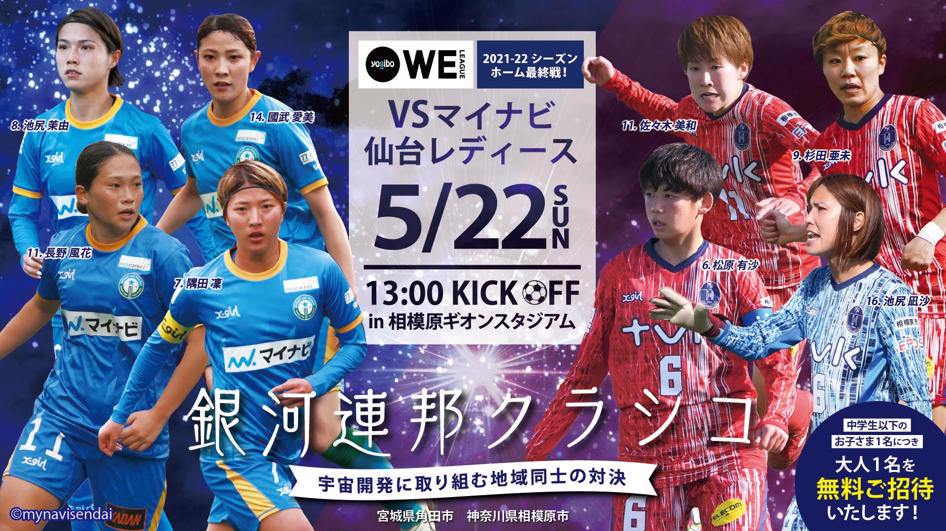 この度、ノジマステラ神奈川相模原は5月22日(日)に2021-22 Yogibo WEリーグ 第22節:マイナビ仙台レディース戦(13:00キックオフ)を相模原ギオンスタジアムで開催致します。