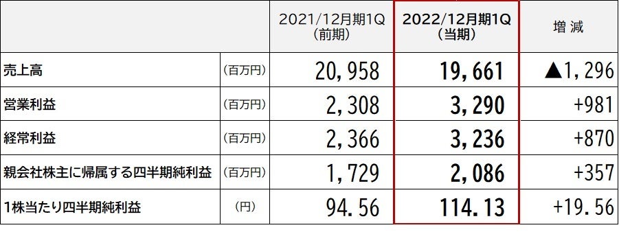 地主株式会社(本社:大阪市中央区今橋、代表取締役会長CEO:松岡哲也)は2022年5月12日、2022年12月期第1四半期連結決算を発表しました。売上高19,661百万円、営業利益3,290百万円、経常利益3,236百万円、親会社株主に帰属する四半期純利益2,086百万円で、営業利益、経常利益、四半期純利益とも、2021年12月期第1四半期連結決算を上回りました。