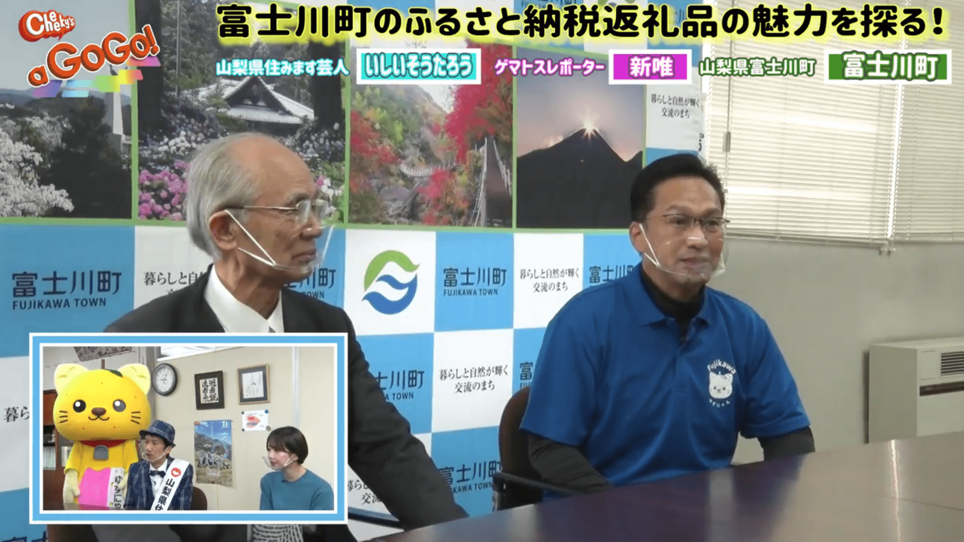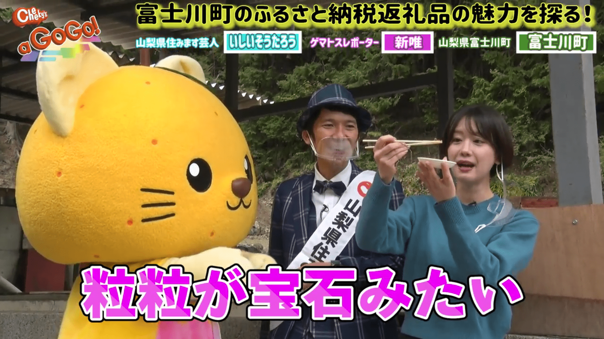 ふるさと納税クラウドファンディングや、BSよしもとでの放送等を活用して全国の自治体をサポートする株式会社GMTS(住所:東京都台東区 代表:八木下重義)はBSよしもとの番組『チーキーズ a GoGo!』(⽉〜⾦・13時〜17時30分⽣放送)内で放送される『ゲマトスグルメレポート』を制作しております。12月1日(木)14:00〜山梨県富士川町の魅力発見プロジェクトについて放送することをお知らせいたします。