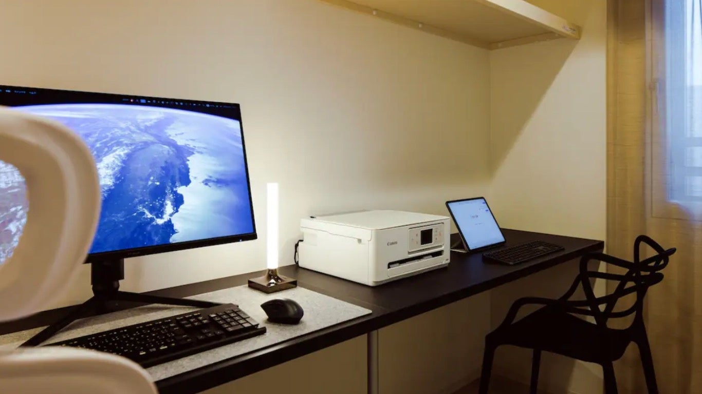 なんといっても、ワークスペースの充実度が◎、ノートパソコン一台であらゆる仕事に対応できる設備が整い、モニター、キーボード、プリンターも完備しています。