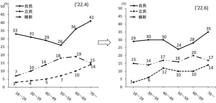 【図1】を参照してください。年齢別の支持率・不支持率のグラフです。岸田内閣の支持率は、ここのところ、4月(左図)のような若年層で低く、年齢の上昇とともに比率の上がる「若低-老高」型の階段構造を示していました。支持と不支持の付置関係については、18~29歳、30代の若年層では不支持が支持を上回っているものの、40代以上の中高年層では支持が不支持を上回り、とりわけ60代や70歳以上の高年層は4月、5月と支持率が上昇し、徐々に支持≫不支持が拡大するという安定的な傾向が続いていました。