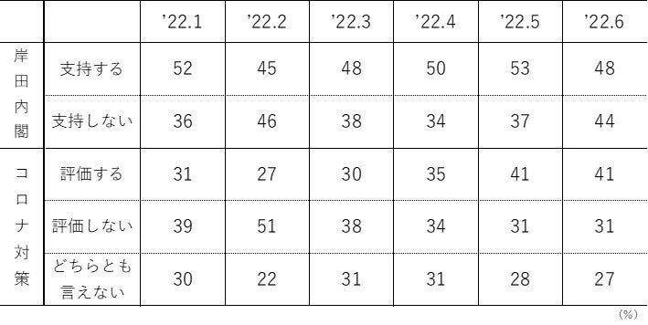 次に【表1】をご覧ください。岸田内閣の支持・不支持と政権の新型コロナ対策への評価について、推移をまとめたものです。5月から6月にかけて、内閣支持・不支持とは対照的に、コロナ対策評価には全く変化がみられません。コロナ対策評価と内閣評価との間の連動関係に、何らかの変容が生じたように思われます。