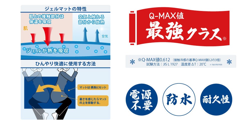 Q-MAX値最強クラス0.612※のジェルマットが肌との接触部分から体温を吸収し(ジェルが熱を吸収)、
