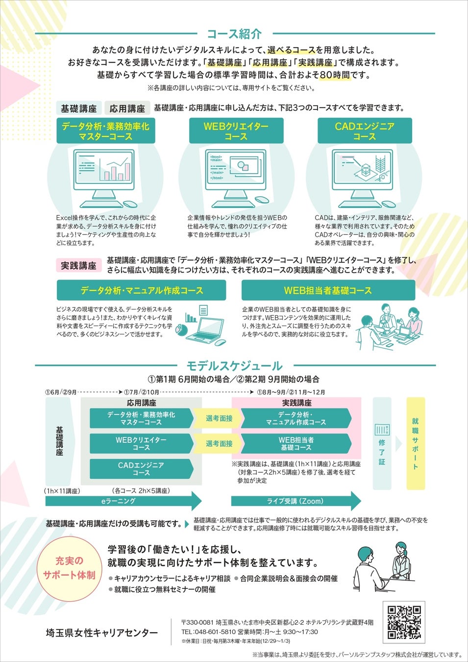 埼玉県は女性のデジタル人材育成講座を実施し、在宅ワークやテレワークを活用して、家庭や趣味と仕事を両立できるワークスタイルを提案します。在宅ワーク、雇用型問わず、自分らしい働き方を見つけていただくサポートも充実!不安なことはプロのキャリアカウンセラーが手厚くフォローいたします。お気軽にお問合せください。