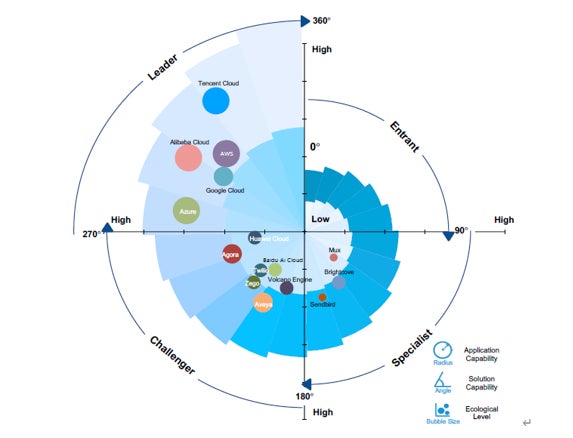 フロスト&サリバンの調査では、業務対応能力(プロバイダーとしての業務提供範囲と経験を調査)、サービス提供能力(プロバイダーのインフラストラクチャ品質を調査)、エコロジカルレベル(プロバイダーの調達、統合、流通チャンネルを調査)という3つの基準を使用してクラウドプロバイダーを評価することにより、競合するクラウドメディアサービスの状況をマッピングしました。テンセントクラウドは、業務対応能力とサービス提供能力で1位となり、エコロジカルレベルでも上位に入りました。