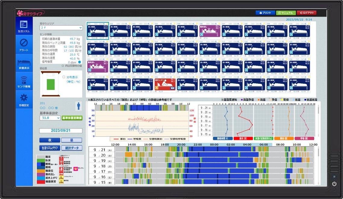 「見守りライフ」は、離床センサーやカメラなどを活用した高齢者見守りシステムです。今あるベッドに荷重センサーやバイタルセンサー、カメラを取り付けることで、24時間365日入居者の状況を見える化し、安否確認のためだけの訪室が不要になるなど、職員の負担軽減を実現します。また、センサーが取得した情報を蓄積することで、データに基づいて適切なタイミングで適切な支援を行い、サービスの質をあげることも可能になります。