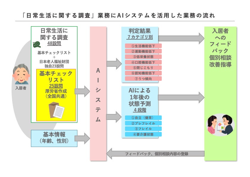 財団が運営する〈ゆうゆうの里〉が毎年、自立した入居者を対象に行っている「日常生活に関する調査」48設問のデータをAIに学習させることにより、入居者の将来の介護予防につながる提案を行うことができるようにしたもので、すでに2022年4月より一部施設において本システムの検証を行なってきました。