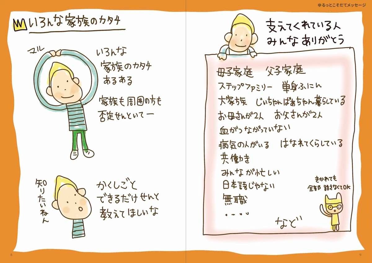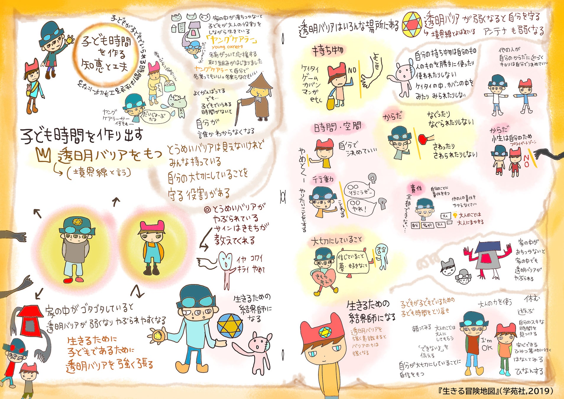 自分を守ること、ごはん、学校、家族、SOSの出し方、心と体など、日常で役立つヒントをイラストで紹介しています。