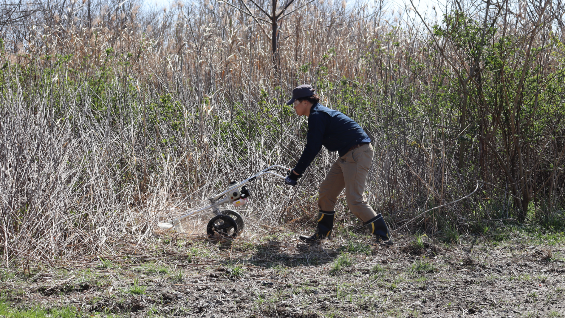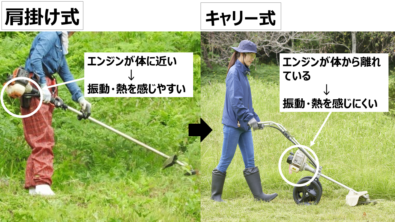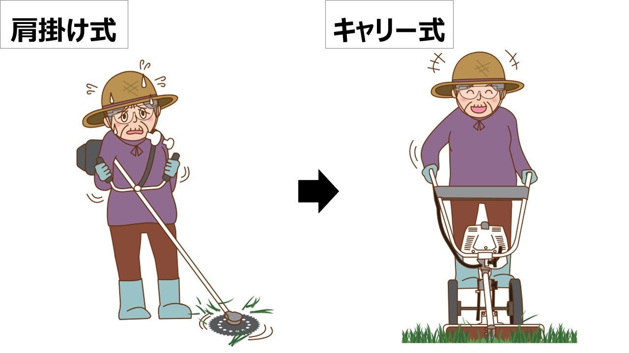 従来の肩掛け式草刈機は肩から掛けた状態で左右に振って草を刈ります。この動きを変えて”押すだけで草が刈れる”『キャリー式草刈機』を開発しました。