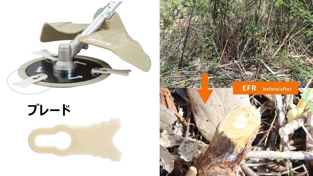 一般的な草刈機は金属刃ですが、刃物が回転するため、怖いイメージを持たれる方も