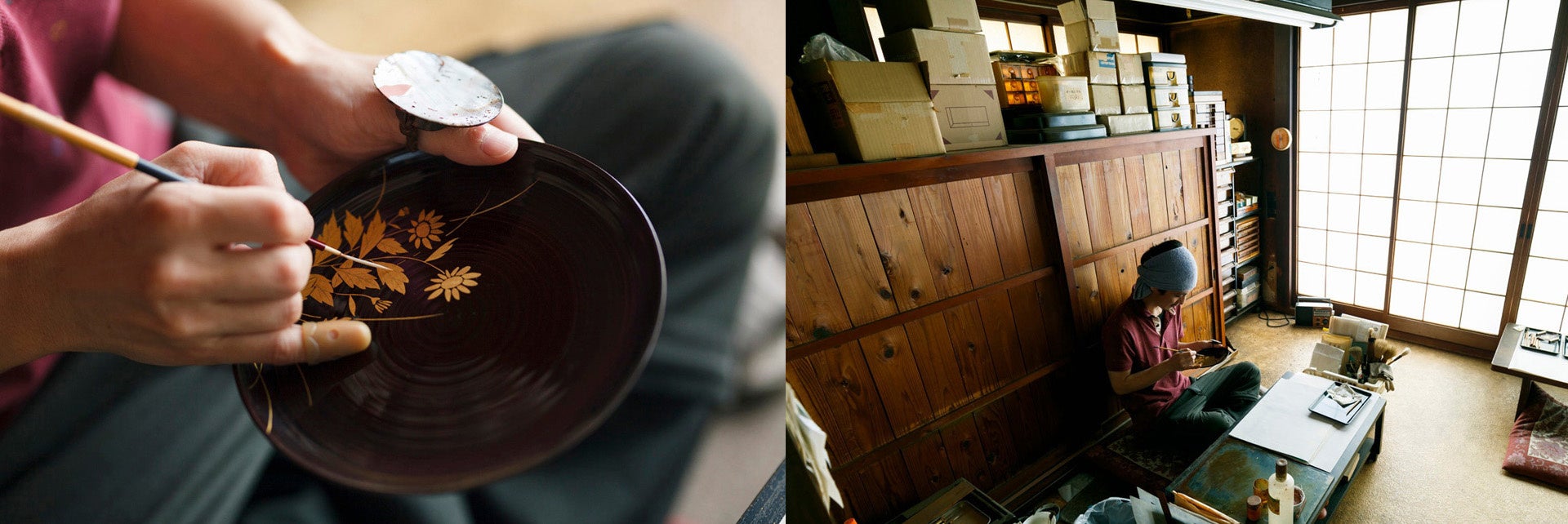 表面仕上げは一つひとつ蒔絵職人による手仕事です。蒔絵は全て手作業。漆で描いた 柄の上に金を蒔き入れます。 筆で描く線の強弱、粉の蒔き加減で表現を変えていきます。 職人の手仕事で一品一品表情に光彩を添えます。