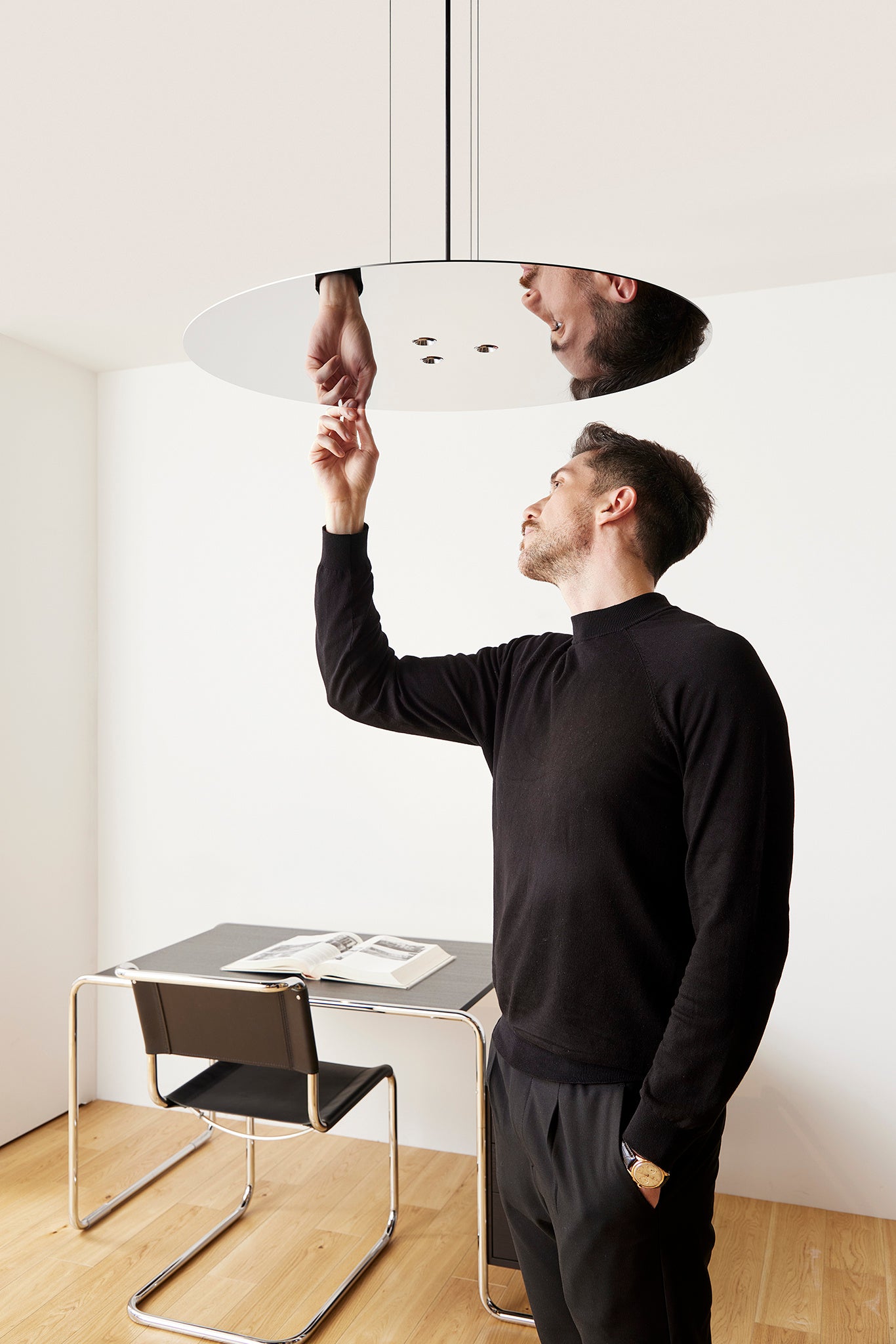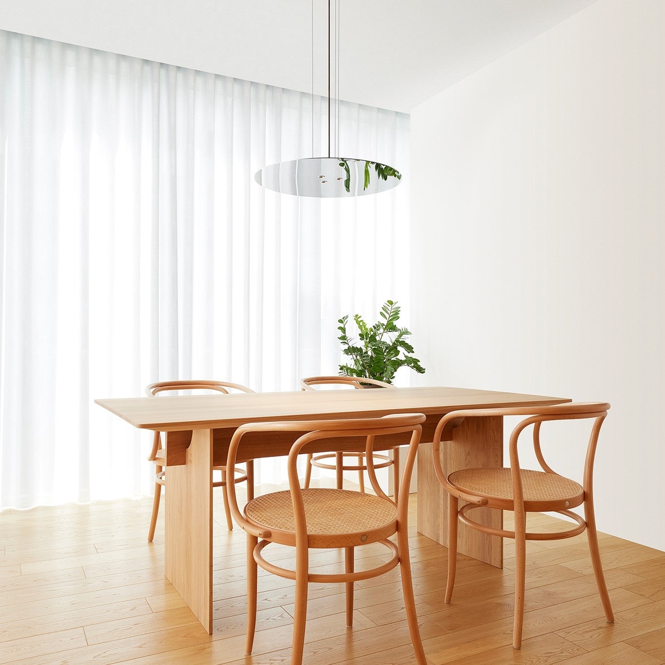 「反射」というシンプルなコンセプトから着想を得たペンダント照明。空間に溶け込むミニマルな形状とステンレスの鏡面が特徴です。円盤と円筒で形をつくるシンプルな構成でありながら、上方向にはやわらかい光を投げかけ、下方向は印象的な光で照らします。ステンレスの鏡面仕上げによって、ランプが空間の中に消える様子とは対照的に、照らされることで、そのシーンは存在感を増します。3つのサイズ展開で、美術館やリビングルーム、日常的なシーンから広々としたホールまで多様な空間で使用いただけます。