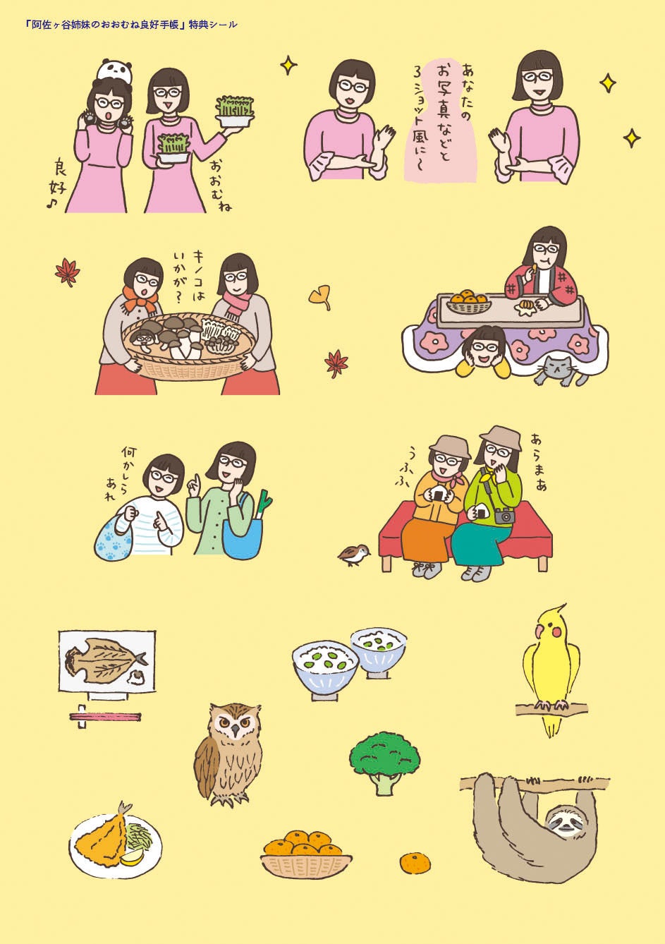 2シート目は、四季折々の阿佐ヶ谷姉妹の日常をイラストにした、大き目サイズのシールです。お好きな所に自由に貼って楽しんでください。