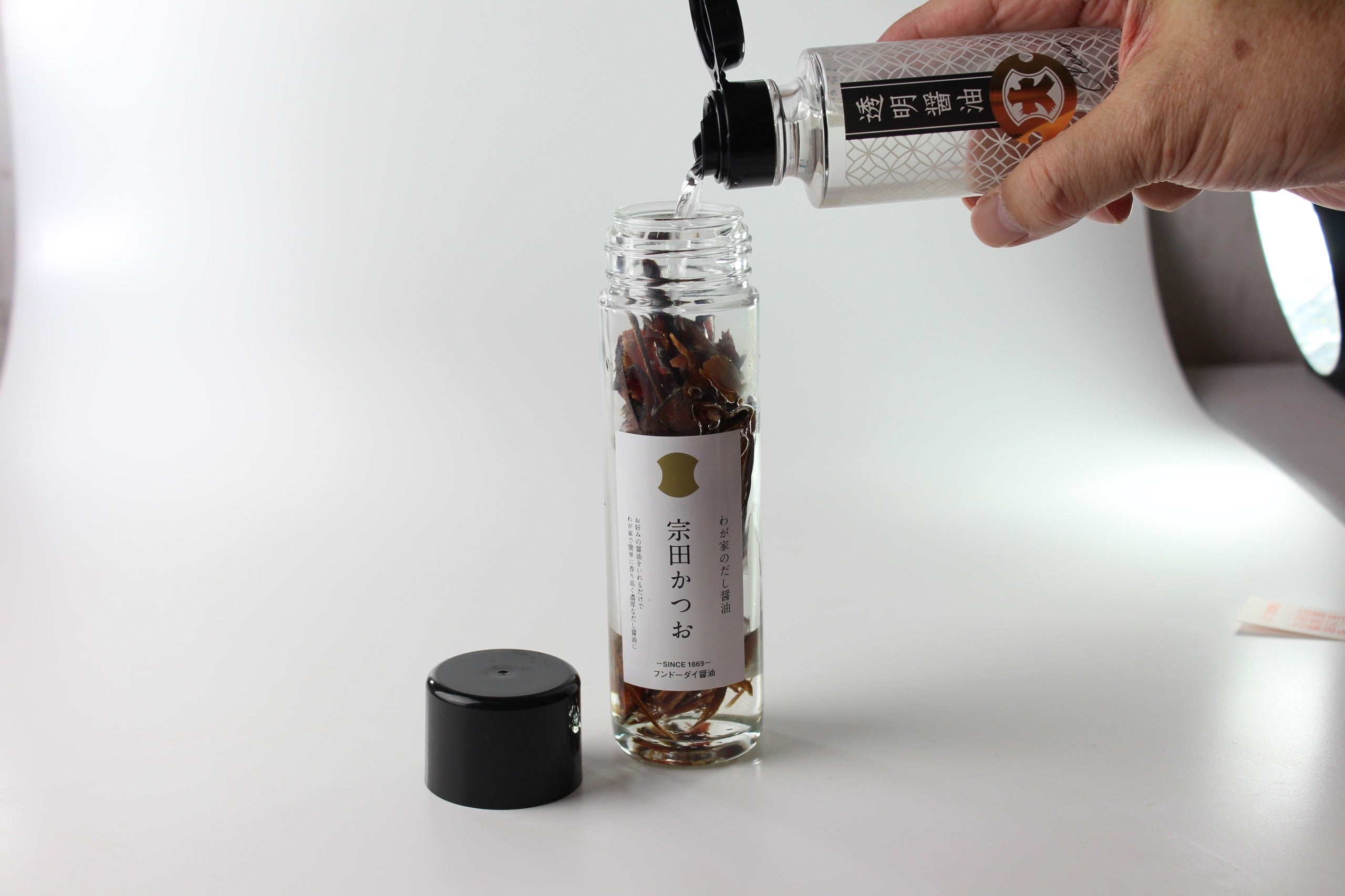 だしの素の「宗田かつお」と「にんにく」それぞれに 150mlの透明醤油を加えて寝かせると、風味豊かな、透明のだし醤油が出来上がります。 「素材の色そのまま」という透明醤油の良さを活かしました。 自分で調味料を作るというオリジナルの感覚を楽しめる商品です。 「宗田かつお」は、卵かけご飯・冷や奴・だし茶漬け(水で希釈)・釜玉うどん・卵焼きに。「にんにく」は、和風ペペロンチーノ・餃子のタレ・牛肉と彩り野菜の炒め物・刺身・ドレッシング(酢、オリーブオイルと合わせて)などに使えます。九州熊本の量販店ほか、フンドーダイ公式通販サイトにて販売。