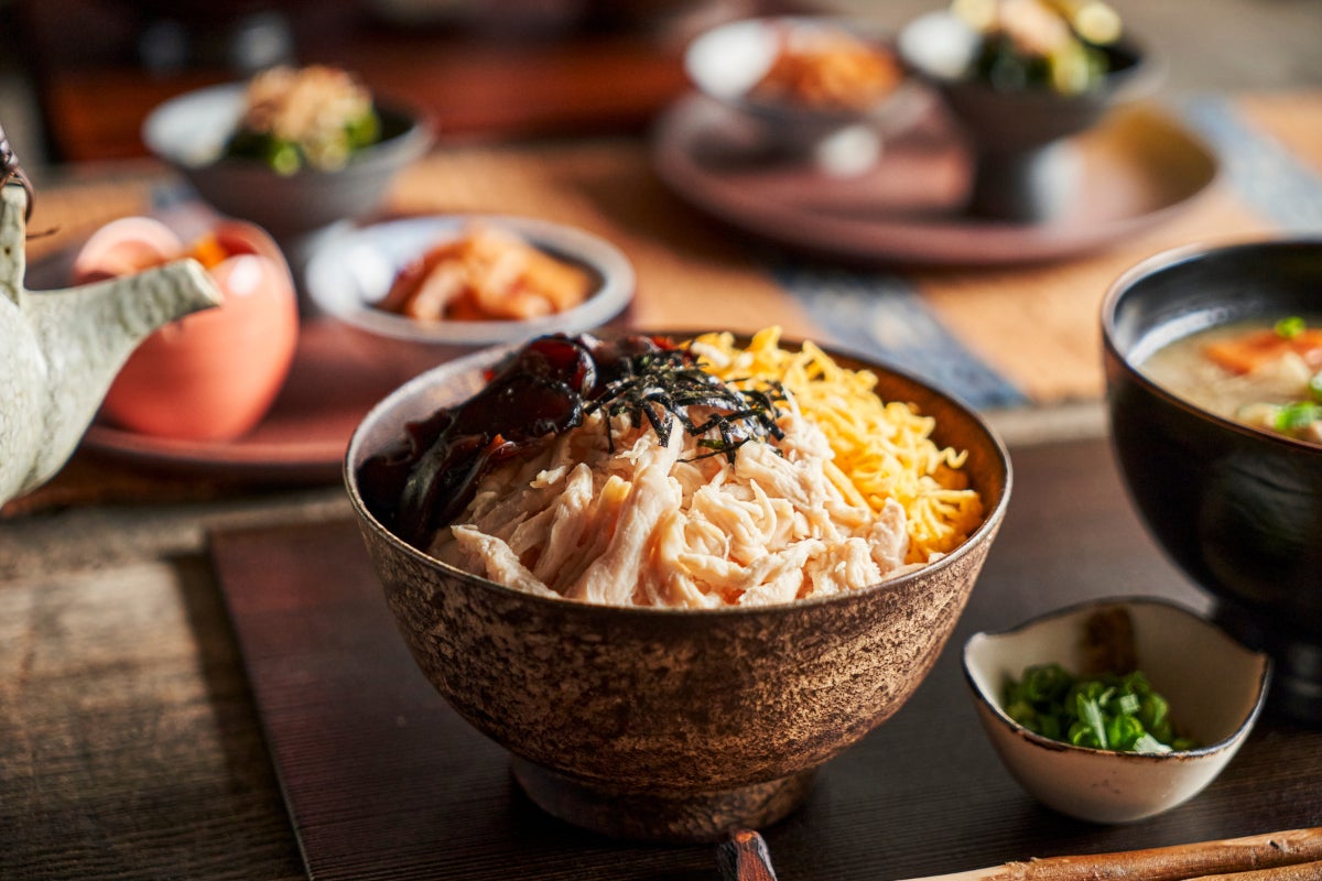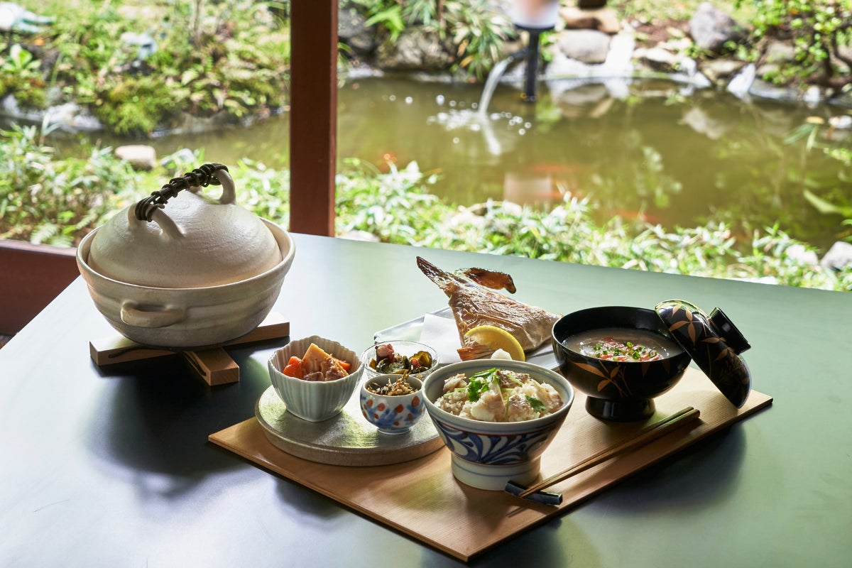 しっとりジューシーな桜島どりに、丸鶏のうまみを凝縮したおだしをかけて味わう贅沢な鶏飯。副菜も鹿児島ならではの味わいが愉しめます。