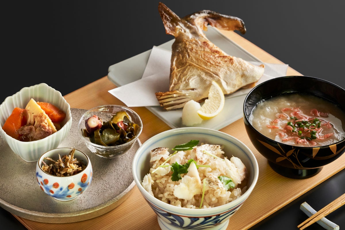 天然真鯛の炙り身を特製のおだしで炊き込む上品な味わいの鯛めし。豪快な塩焼きにしたはまちは瀬戸内レモン果汁をかけて爽やかにも愉しめます。