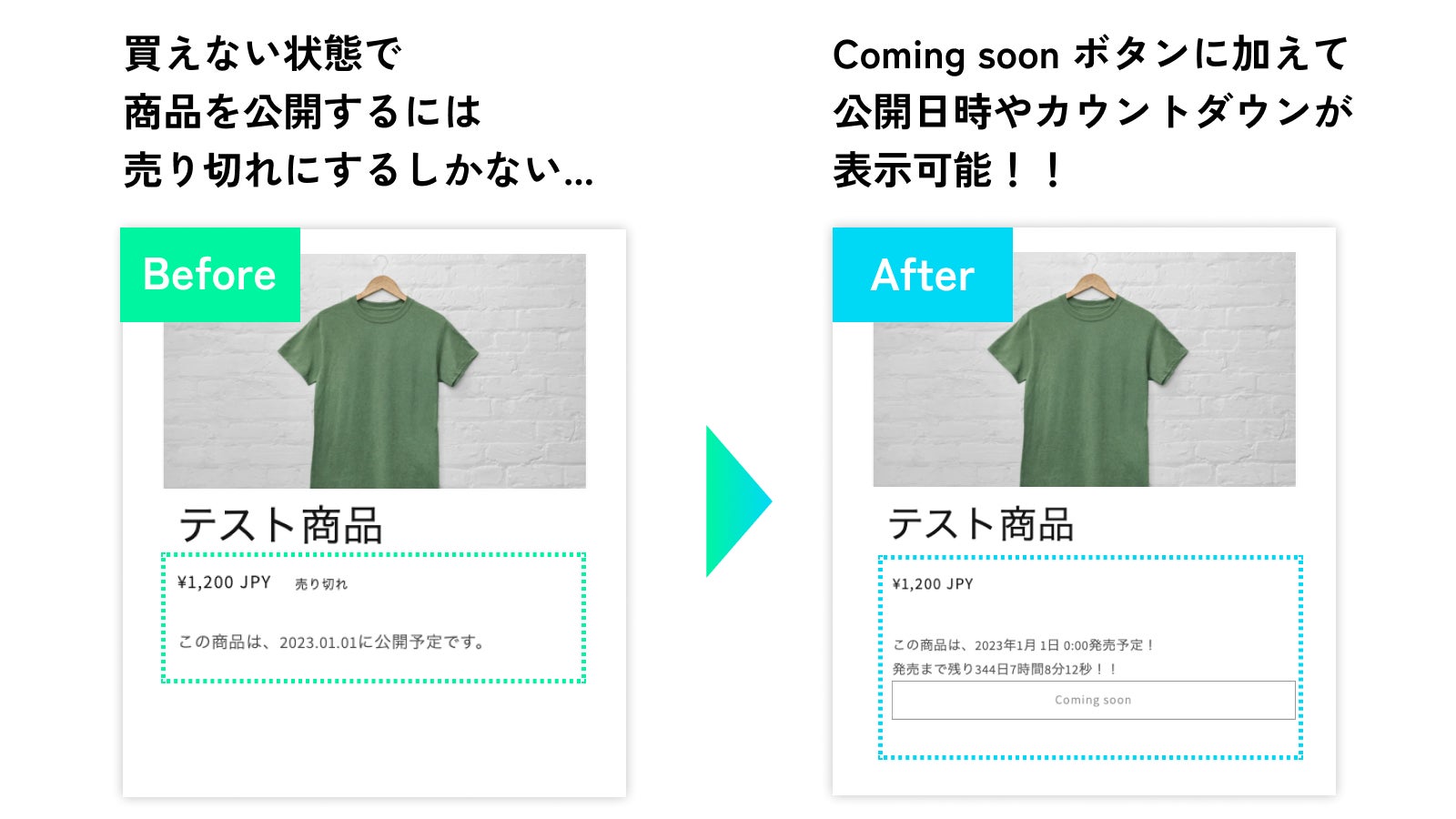 「商品ページ発売予告アプリ|リテリア Coming Soon」は、商品を購入できない状態のまま、発売日時の予告をする「Coming Soon機能」を実現するアプリです。通常、Shopifyにおいて商品を買えない状態で公開するには「売り切れ」にするしかありません。しかし、「商品ページ発売予告アプリ|リテリア Coming Soon」を使用すれば、「売り切れ」ボタンをComing Soon等に変更できるほか、公開日時やカウントダウン表示が可能になります。