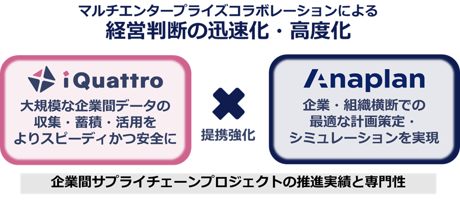 このたび、「Anaplan」と「iQuattro」の連携により、お客さまの持続可能なサプライチェーンの実現に寄与すると判断し、企業・拠点間における情報・計画連携領域での連携を強化しました。今後、両社ではプロジェクト推進・技術面での連携による共同でのサービス強化を行い、それに伴う、人材育成や販売強化を推進していきます。