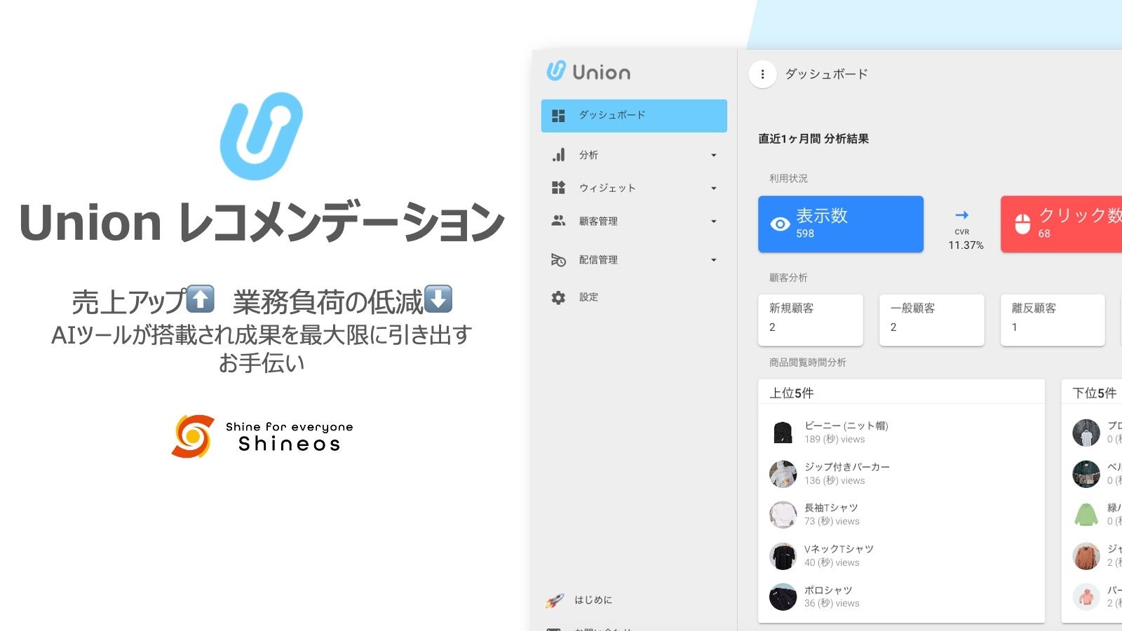 「ウィジェットの利用状況分析」や「商品閲覧時間分析」、「顧客セグメント分析」が可能です。