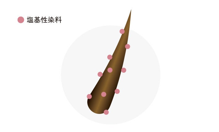 髪表面で発色する染料を使用。キューティクルを開いて染める染料ではなく、髪の表面に結合して、美しい発色を叶える《 塩基性染料 》を使用。傷んだ髪ほど吸着しやすい性質があります。