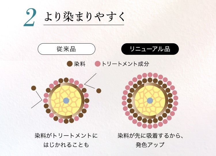 成分が吸着するタイミングを調整。染料が先に髪に吸着しやすくなり、更に発色が良くなりました。