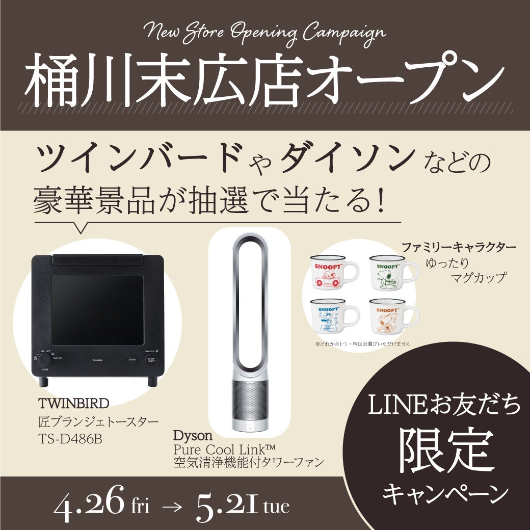 オープンを記念して、大人気トースターや高性能空気清浄機が当たるプレゼントキャンペーンを実施いたします!その他多彩なご購入特典が盛りだくさん!
