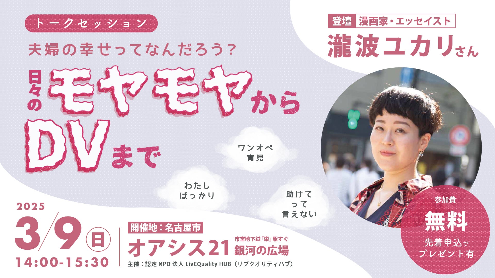 シングルマザーに「住まい」と「繋がり」を届ける認定NPO法人LivEQuality HUB(所在地:愛知県名古屋市、代表理事:岡本 拓也)は2025年3月、名古屋にて、瀧波ユカリさんをゲストにお迎えしたトークセッション「夫婦の幸せってなんだろう?日々のモヤモヤからDVまで」を開催いたします。