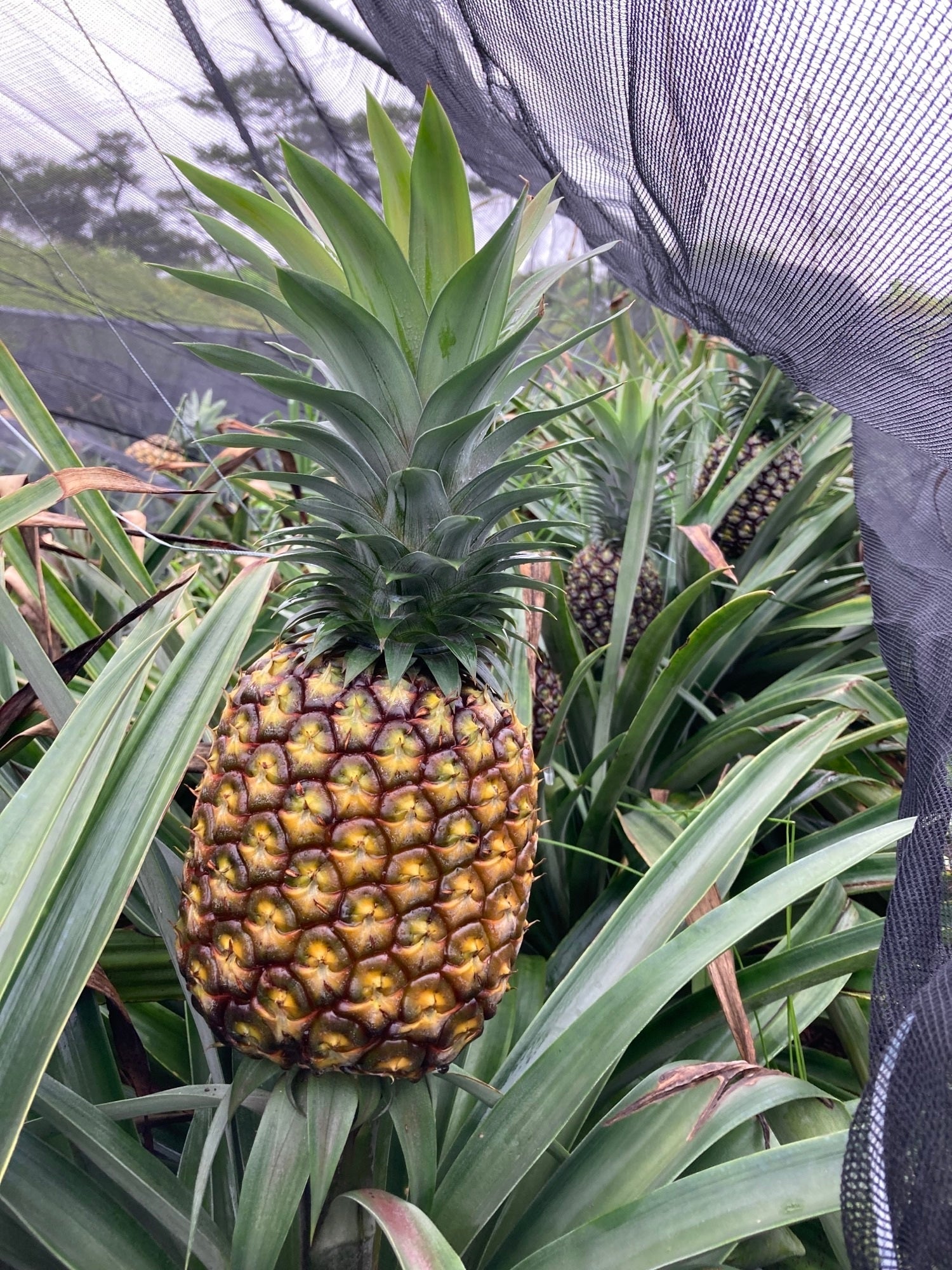 パイナップルの栽培は、葉っぱの上に花が咲きその上に実がなります。品種によっては大きく成長するにつれ傾いて倒れるため、パイナップル一つ一つを紐で結び転倒防止をしています。また、西表島では日差しが強く、日焼け防止のため、そしてカラス除けの対策として黒いネットを被せたりとやることは沢山あります。パイナップルは収穫までに丸2年を要します。収穫までの間、愛情いっぱいに管理され、安心安全なパイナップルに育てられます。