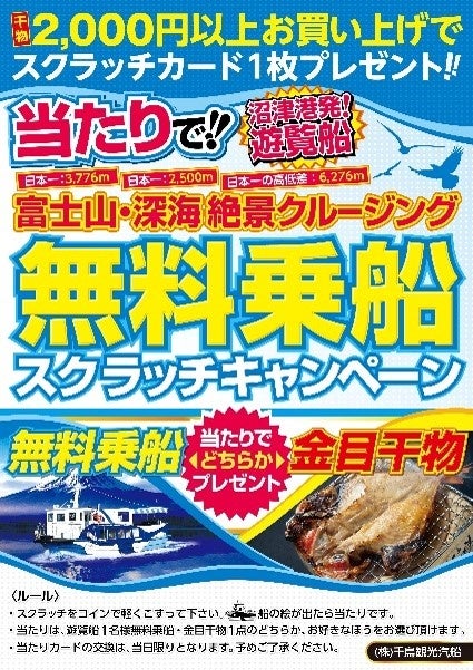この度、リニューアルオープンを記念して、「ひものセンター」で干物を2,000円以上ご購入のお客様に、遊覧クルーズチケット、または美味しい干物が当たるスクラッチキャンペーンを実施いたします。