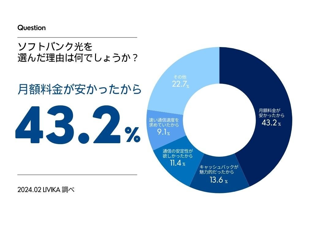 1位は「月額料金が低かったから」(43.2%)、2位は「キャッシュバックの魅力があったから」(13.6%)のように、約55%の利用者がコストパフォーマンスを重視している結果となりました。