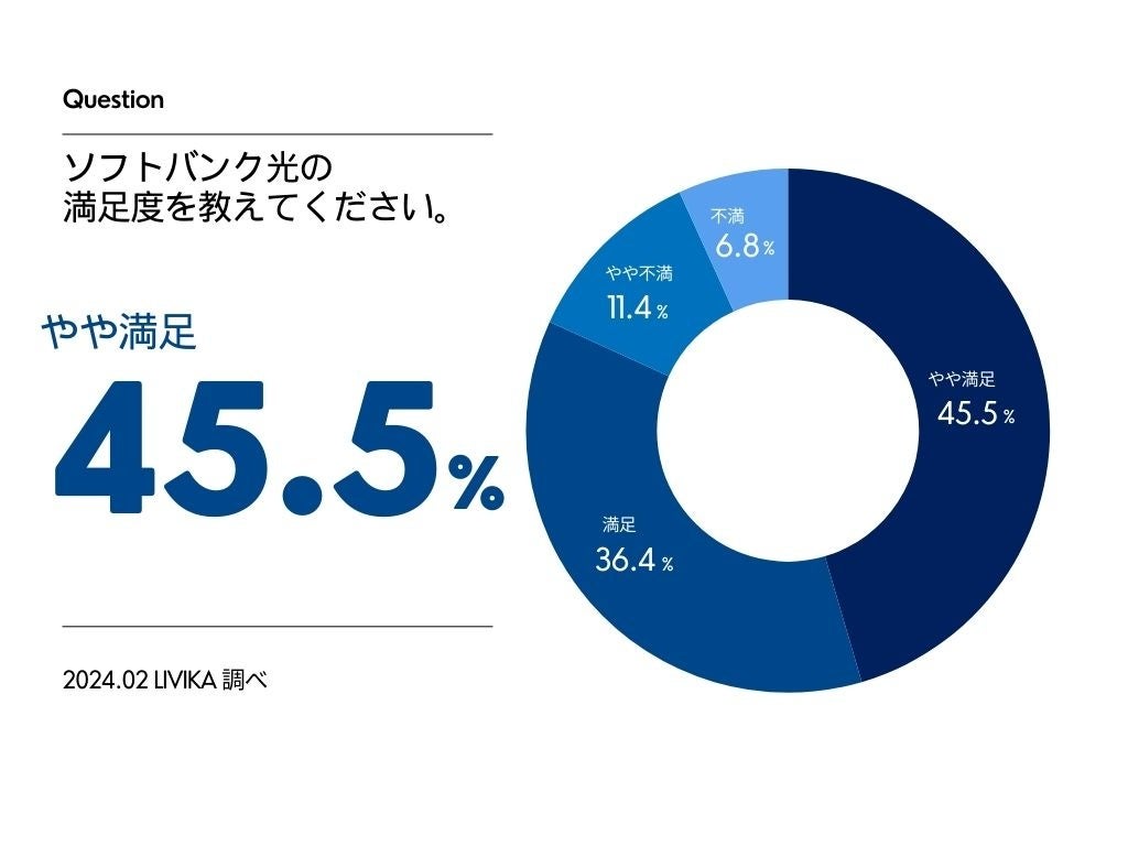 ソフトバンク光の満足度に関する調査を実施したところ、「やや満足」が45.5%、「満足」が36.4%と全体の80%が「満足」と回答しており、極めて高い満足度が確認されました。