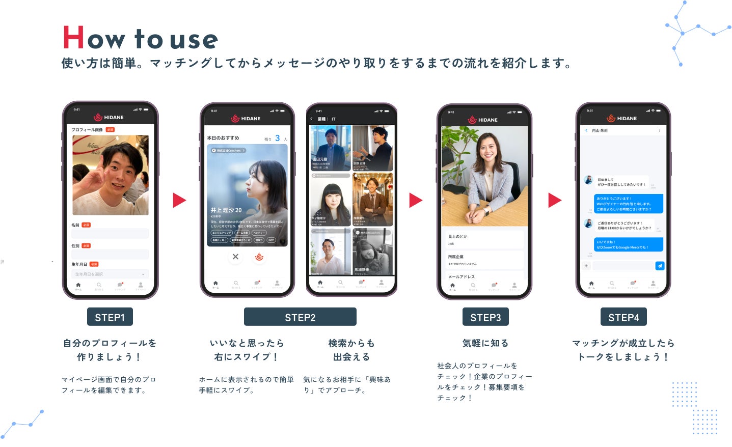 人の価値観を軸に据え、完全成果報酬型の長期インターンサービス「HIDANE」をリリースしました。「カルチャーマッチや、スキル、経験などで採用要件を作成しても、 学生に情報が少ないため、マッチ度が高い学生を見つけ出すことが出来ない」「 学生の就職活動が多様化したため、企業としてやるべきことが多様になり、 学生との直接的なつながりを保つための時間を作ることが出来ない。」といった採用課題を解決するため、自社に合った人材を気軽に見つけ、どのように相手に選んでもらうのかを追求し、企業の価値を高めていくことを目指します。