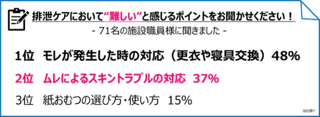 排泄物を吸収したおむつを長時間使用することは、高齢者のお肌において、スキントラブルなどの大きな影響を及ぼします。また「排泄ケアにおいて“難しい”と感じるポイント」を介護施設職員に質問をしたところ、「モレが発生した時の対応」に次いで、2位に「スキントラブルの対応」があがっています。