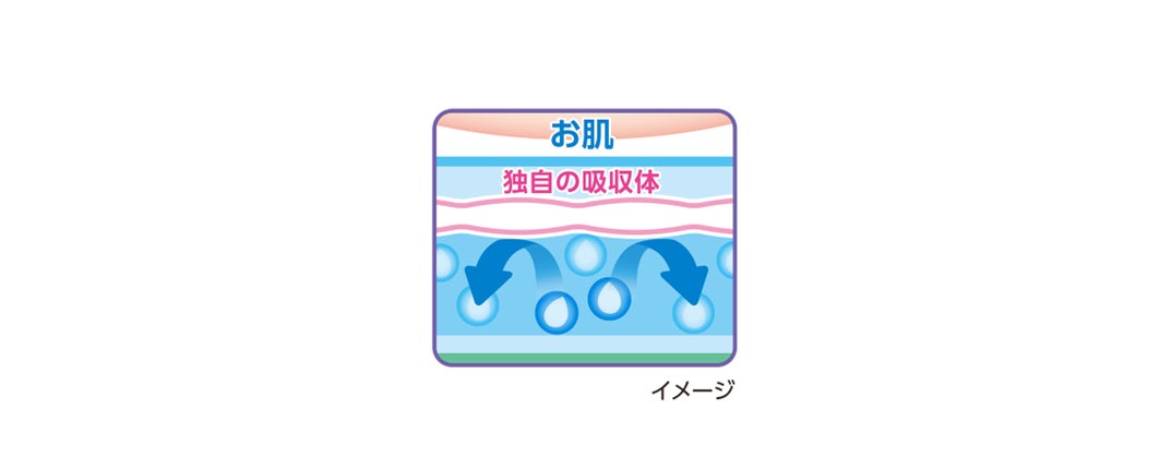 独自の吸収体がたくさんの尿をしっかり吸収するので逆戻りを防ぎ、さらさら快適が続きます。
