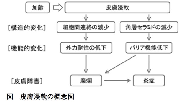 高齢者の皮膚は薄くなっているため、皮膚浸軟が加わると容易に物理的バリアが破壊され、さらに重症化しやすく、破綻したバリア機能の回復に時間を要することが示されています。そのため、高齢者では皮膚浸軟の予防と、できるだけ早急な介入がスキントラブル・IADの予防に有効です。