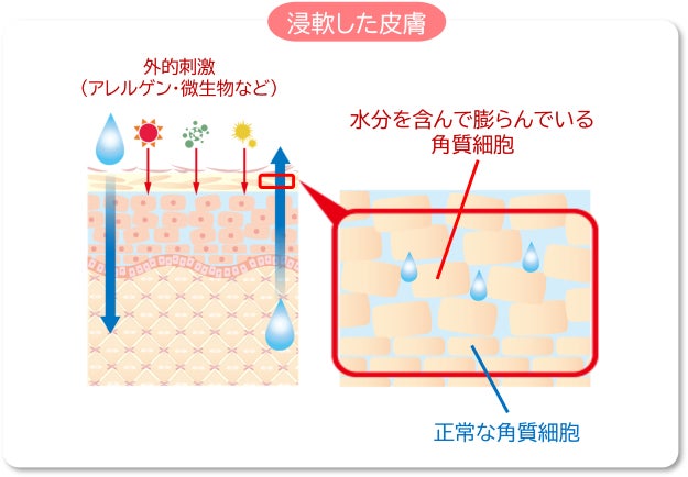 角層水分量の大幅な上昇が続くと、角質細胞が水分を含んで膨らみます。細胞同士の結びつきがゆるくなり、摩擦が大きくなることで表皮剥離が発生しやすく、外的刺激を直接的に受けてしまいます。