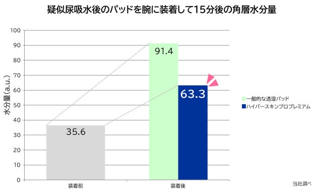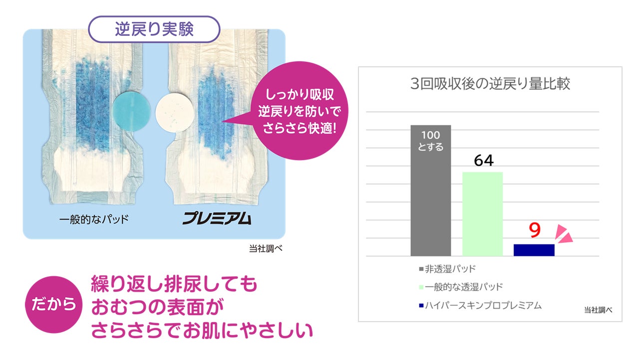 排尿後、一般的な夜用パッドは体圧などの影響によって尿の逆戻りが発生し、短時間でも角層水分量が上昇します。一方「ハイパースキンプロ」はすばやく引き込む表面シートや独自の吸収体によって尿の逆戻りを防ぐことで角層水分量の大幅な上昇を防ぐことが確認出来ました。