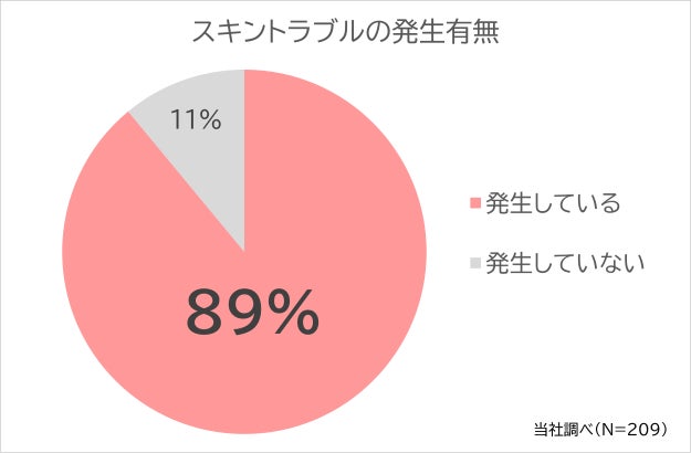 当社の調査によると全国の介護施設209件のうち、紙おむつ着用におけるスキントラブルの発生が89%となっており、スキントラブルの症状として発赤が多く見られる回答結果となりました。
